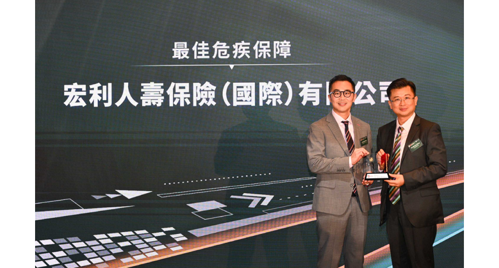 ▲ 宏利「活耀人生危疾保PRO」勇奪「最佳危疾保障」大獎,由宏利香港及澳門市場策劃及產品開發部主管黃俊麒(左)擔任領獎代表。