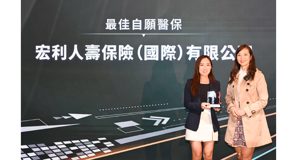 ▲ 「宏利晉悅自願醫保靈活計劃」榮膺「最佳自願醫保」大獎,由宏利香港及澳門市場策劃及產品開發部總監梁詠儀(左)代表領獎。