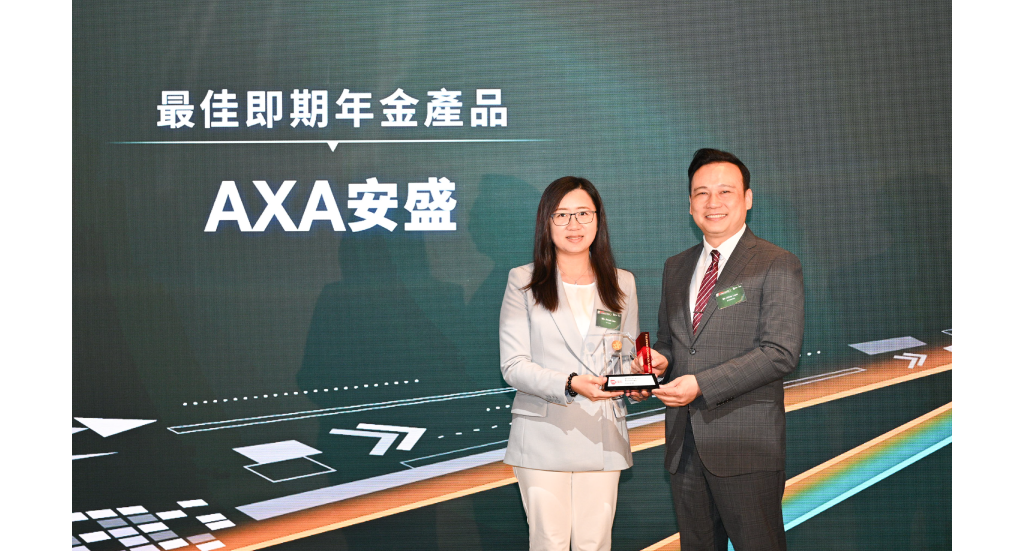 ▲ AXA安盛首席人壽及醫療保險業務總監李佩瑜(左)從頒獎嘉賓手中接過「最佳即期年金產品」獎座。