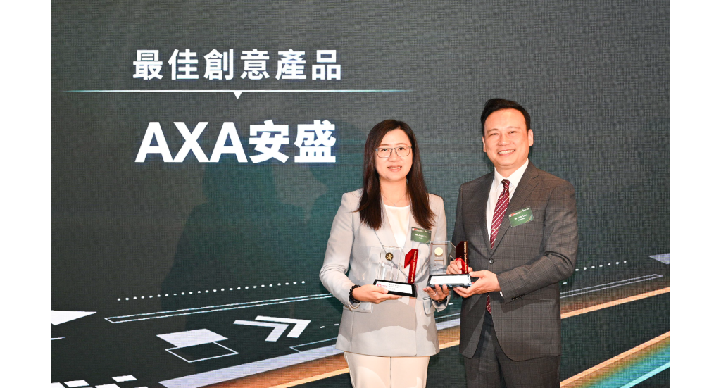 ▲ AXA安盛首席人壽及醫療保險業務總監李佩瑜(左)從頒獎嘉賓手中接過「最佳創意產品」獎座。